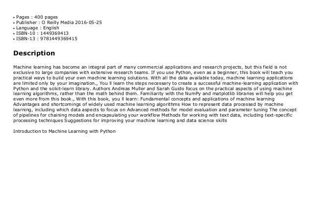![Introduction to Machine Learning with Python [Book] introduction to machine learning with python oreilly pdf download](https://image.slidesharecdn.com/introduction-to-machine-learning-with-python-181116204023/95/introduction-to-machine-learning-with-python-2-638.jpg?cb=1542400835)